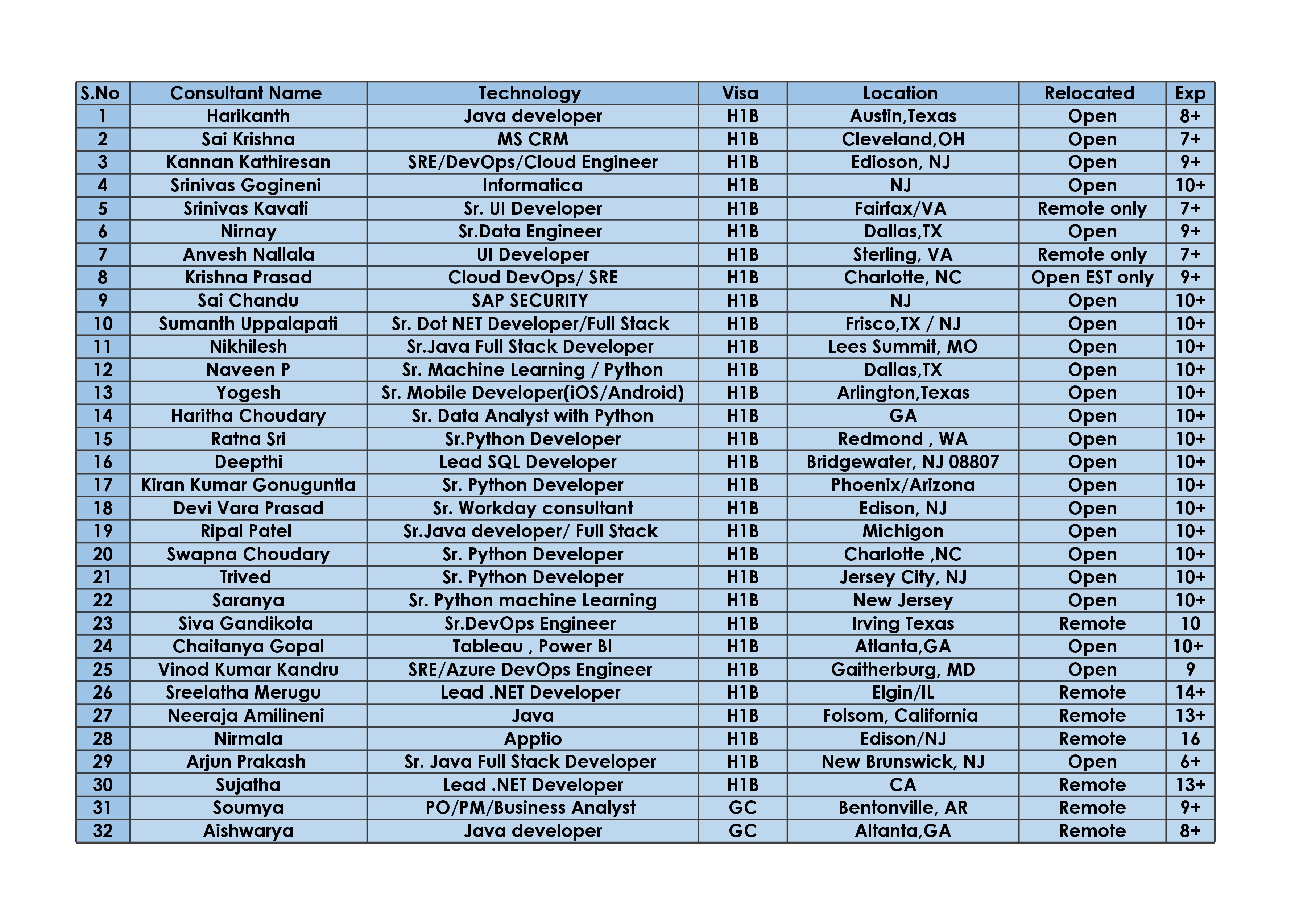 http://bit.ly/4ey8w48 https://jobs.nvoids.com/job_details.jsp?id=1714516&uid= Hi I hope you are doing great! This is Henry from Binary Computer Int'l Corp I do have a consultant on my bench looking for an immediate project. Please find the below Updated Hotlist and let me know if you have any suitable requirements on C2C S.No Consultant Name Technology Visa Location Relocated Exp 1 Harikanth Java developer Austin,Texas Open 8+ 2 Sai Krishna MS CRM Cleveland,OH Open 7+ 3 Kannan Kathiresan SRE/DevOps/Cloud Engineer Edioson, NJ Open 9+ 4 Srinivas Gogineni Informatica NJ Open 10+ 5 Srinivas Kavati Sr. UI Developer Fairfax/VA Remote only 7+ 6 Nirnay Sr.Data Engineer Dallas,TX Open 9+ 7 Anvesh Nallala UI Developer Sterling, VA Remote only 7+ 8 Krishna Prasad Cloud DevOps/ SRE Charlotte, NC Open EST only 9+ 9 Sai Chandu SAP SECURITY NJ Open 10+ 10 Sumanth Uppalapati Sr. Dot NET Developer/Full Stack Frisco,TX / NJ Open 10+ 11 Nikhilesh Sr.Java Full Stack Developer Lees Summit, MO Open 10+ 12 Naveen P Sr. Machine Learning / Python Dallas,TX Open 10+ 13 Yogesh Sr. Mobile Developer(iOS/Android) Arlington,Texas Open 10+ 14 Haritha Choudary Sr. Data Analyst with Python GA Open 10+ 15 Ratna Sri Sr.Python Developer Redmond , WA Open 10+ 16 Deepthi Lead SQL Developer Bridgewater, NJ 08807 Open 10+ 17 Kiran Kumar Gonuguntla Sr. Python Developer Phoenix/Arizona Open 10+ 18 Devi Vara Prasad Sr. Workday consultant Edison, NJ Open 10+ 19 Ripal Patel Sr.Java developer/ Full Stack Michigon Open 10+ 20 Swapna Choudary Sr. Python Developer Charlotte ,NC Open 10+ 21 Trived Sr. Python Developer Jersey City, NJ Open 10+ 22 Saranya Sr. Python machine Learning New Jersey Open 10+ 23 Siva Gandikota Sr.DevOps Engineer Irving Texas Remote 10 24 Chaitanya Gopal Tableau , Power BI Atlanta,GA Open 10+ 25 Vinod Kumar Kandru SRE/Azure DevOps Engineer Gaitherburg, MD Open 9 26 Sreelatha Merugu Lead .NET Developer Elgin/IL Remote 14+ 27 Neeraja Amilineni Java Folsom, California Remote 13+ 28 Nirmala Apptio Edison/NJ Remote 16 29 Arjun Prakash Sr. Java Full Stack Developer New Brunswick, NJ Open 6+ 30 Sujatha Lead .NET Developer CA Remote 13+ 31 Soumya PO/PM/Business Analyst Bentonville, AR Remote 9+ 32 Aishwarya Java developer Altanta,GA Remote 8+ Thanks & Regards Henry SR. Technical Recruiter / Bench Sales 50 Cragwood Road, Suite 209, South Plainfield, NJ 07080 Email Id: [email protected] LinkedIn: linkedin.com/in/mohd-fahad-henry-b4bb95251 Office: 732 913 8429 Phone no: 9160443404 "Best way to reach me is by email" From: [email protected] <[email protected]> on behalf of Siddhartha Sunkari <[email protected]> Sent: Tuesday, September 3, 2024 9:18 AM To: Siddhartha Sunkari <[email protected]> Subject: TODAY HOTLIST Good morning Greetings of the day !!! I Am happy to share our experienced resources. Consultants are open to work. Please feel free to request a resume for review and/or share any position that you feel may be a good fit. Please add my email to your contribution list : [email protected] Thanks & Regards Siddhartha. s Sr. Bench sales Recruiter Desk: 8322418771 EXT : 116 Email: [email protected] LinkedIn Id: linkedin.com/in/siddharth-s-113716260 Office web: www.fluxteksol.com Certified Woman Owned Business Enterprise (WBE) Women Owned Small Business (WOSB) Certification -- -- Keywords: user interface access management business intelligence information technology purchase order card microsoft Arkansas California Georgia Idaho Illinois Maryland Missouri New Jersey North Carolina Ohio Texas Virginia Washington TODAY HOTLIST [email protected] hotlist http://bit.ly/4ey8w48 https://jobs.nvoids.com/job_details.jsp?id=1714516&uid= |