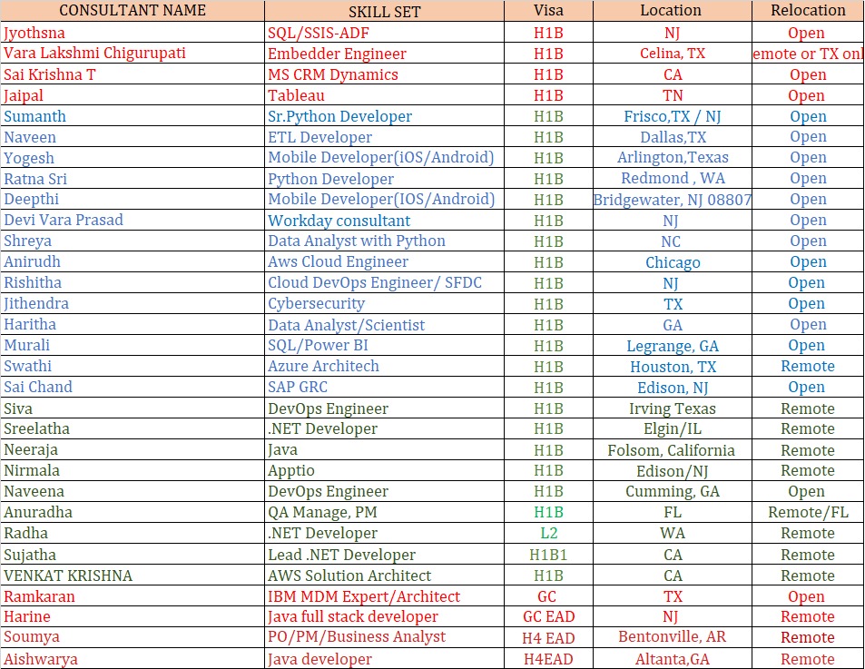 http://bit.ly/4ey8w48 https://jobs.nvoids.com/job_details.jsp?id=2208283&uid= Hi, I hope you are doing great! This is Henry from Binary Computer Int'l Corp I do have a consultant on my bench looking for an immediate project. Please find the below Updated Hotlist and let me know if you have any suitable requirements on C2C Name: Mohammed AbdulSaqib Experience: 9+ Visa Status: Location: Virginia (Relocated Anywhere in US) Role: AWS Cloud/DevOps Engineer Name: JITHENDRA Experience: 9+ Visa Status: Location: Denton , Texas Relocated Anywhere in US) Role: Sr. Cyber Security Analyst Name: Ram Karan Experience: 24+ Visa Status: Location: Frisco, Texas Relocated Anywhere in US) Role: MDM Developer / AI / ML Name: Vara Lakshmi Chigurupati Experience: 15+ Visa Status: Location: Celina, TX (Relocated Anywhere in US) Role: Embedder Engineer Thanks & Regards Henry SR. Technical Recruiter / Bench Sales 50 Cragwood Road, Suite 209, South Plainfield, NJ 07080 Email Id: [email protected] LinkedIn: linkedin.com/in/mohd-fahad-henry-b4bb95251 Office: 732 913 8429 Phone no: 9160443404 "Best way to reach me is by email" From: [email protected] <[email protected]> on behalf of Ruby Singh <[email protected]> Sent: Tuesday, February 25, 2025 12:22 PM To: Manoj Sistla <[email protected]> Cc: [email protected] <[email protected]>; [email protected] <[email protected]>; [email protected] <[email protected]>; [email protected] <[email protected]>; [email protected] <[email protected]>; [email protected] <[email protected]> Subject: Re: Sr Project manager ll 15+ years consultants ll STATE OF VA Skills Visa Experienc Current Location Relocation software engineer 8+ years wylie, tx Anywhere In US Data Analyst/Power Bi 9 years Irving TX Anywhere In US Java Developer 8 years Chicago, IL Anywhere in US Servicenow Developer 12+ years Frisco, TX Remote Sr. Fullstack Java Developer 10 Years Rosedale, NY Remote Scrum Master/PM - 9 years Dallas, Tx Anywhere In US Java developer 10 Years Dallas, TX Anywhere In US SAP Security 7+Years Texas, Irving Anywhere In US Lead Java Full Stack Developer 14+ years Lewis Center, OH Remote Network Engineer 6+ years West haven,CT Anywhere In US DATA EnGINEER 8+ years Dallas, TX Anywhere In US Sr. Fullstack Java Developer 10 Years ARLINGTON TX Anywhere In US Sr. Fullstack Java Developer - 9 years Austin, Tx Anywhere In US Lead UI Full stack Developer 12+ years Dallas, TX Remote Salesforce Developer 8+ years Patterson, LA Anywhere In US Data Engineer 8+ years Piscataway, NJ Anywhere In US Network Engineer 10 Years kansas , MO Anywhere In US Full stack java developer 8 Years Chicago, IL 60016 Anywhere In US Full stack java developer 8 Years Edison , NJ Anywhere In US Devops Engineer 8 Years ARLINGTON TX Anywhere In US Full Stack Java Developer OPT 5 Years West Des Moines, IA Anywhere In US Full Stack Java Developer 8 Years Minneapolis, MN Anywhere In US Data Engineer 8 Years Bridgeport, CT Anywhere In US Network Engineer 8 Years Irving, TX Anywhere In US Full stack java developer 8+ years BridgeWood, CT Anywhere In US Network Engineer 8+ years Long Beach, MS Anywhere In US Full stack java developer 8+ years Bridgeport, CT 06604 Anywhere In US For any immediate needs or inquiries, feel free to contact me directly at +1 214-831-7547 Ext: 1012 . Im also available via at +1 (305) 428-7464 . Thanks & Regards. -- Ruby Singh Team Lead - Asura IT Consulting [email protected] +1 214-831-7547 Ext: 1012 Linkedin: https://www.linkedin.com/in/ruby-singh-9891831b3/ https://www.asuraitconsulting.com On Tue, Feb 25, 2025 at 10:04PM Manoj Sistla <[email protected]> wrote: Job Title - Sr Project Manager 4 - IN PERSON IVS ONLY Start Date - 03/01/2025 End Date - 02/28/2026 Interview Type - In-Person Only Work Arrangement - Onsite Full Job Description - The incumbent is responsible for leading cloud hosted SaaS projects and business change management that focus on leveraging modern technology to improve public safety and Virginia State Police (VSP) customer services statewide. Most projects have a high degree of complexity. In addition, the incumbent will: Perform project planning. Lead project teams. Create and manage project budgets. Manage project scope. Identify project risks and risk mitigation strategies. Lead requirements documentation. Manage relationships and coordinate with interface partners, suppliers and VSP technical staff. Lead business change management, with an emphasis on effective communications, building stakeholder trust and measuring performance. Coordinate changes to network infrastructures in partnership with technical staff. Coordinate the deployment of equipment used by SaaS applications. Prepare reports for VSP and VITA management. Perform other duties as assigned. The person selected for this position will work full-time onsite at Virginia State Police Headquarters, 7700 Midlothian Tpke, North Chesterfield, VA 23235. Working hours are Monday through Friday, 8:30am to 5:00pm, excluding state holidays. Knowledge, Skills, and Abilities Project manager of record on a Category 1 or 2 Commonwealth project of $5 million or more, or completion of non-COV project with a value greater than $10 million. Experience managing large projects and PMP certification. Proven leadership skills. Advanced computer skills are required that aligns with the Job Description. Strong decision-making and strong analytical skills. Ability to create and manage project schedules. Experience leading organizational change management. Good verbal and written communication skills. Proficiency with Microsoft products (MS Project, Word, Excel, PowerPoint, Visio, Outlook). Skills Matrix - Skill Required / Desired Amount of Experience PM of record on a Category 1 or 2 Commonwealth project of $5 million or more, or completion of non-COV project with a value greater than $10 million Required Experience managing large projects and PMP certification. Required 10 Years Proven leadership skills. Required 10 Years Advanced computer sk