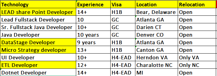 Business Partners, Greetings from Reliant Vision. We have an excellent IT Contractors Pool available on different skills with multiple consultants on each technology and I am furnishing some of them below. I would like to know if you have any suitable positions for below mentioned. Appreciate if you can help by forwarding my details to your recruiter or resources, who are dealing with contract jobs on above skills in your circle. Please reach Victor M Senior Bench Sales Recruiter Call : +1 732-769-8913 Email: [email protected] LinkedIn: https://www.linkedin.com/in/victor-paul-271350281/ Reliant vision Group Inc 32 Bridge Street, Metuchen, NJ 08840 Website: www.reliantvision.com Keywords: access management information technology New Jersey |
