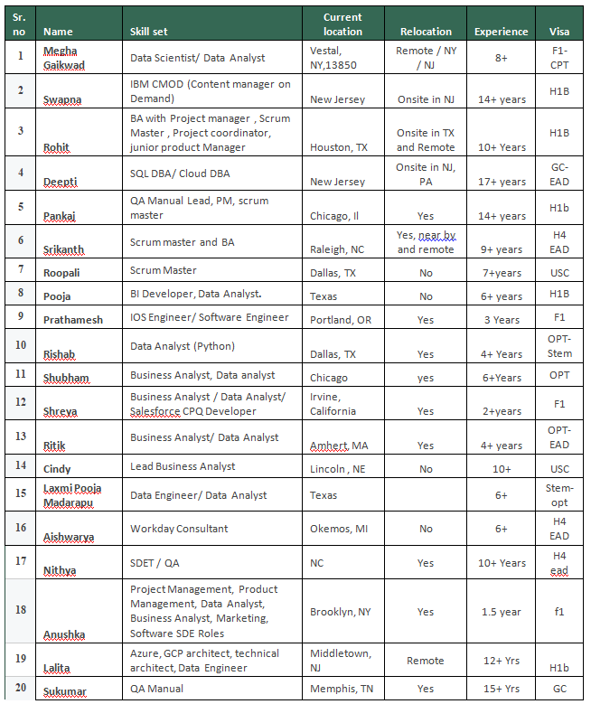 I am Aishwarya, Bench Sales Recruiter from Global IT LLC, (Not For Bench Sales Recruiter) Below are my Consultants who are available for immediate projects Please share Direct Client C2C Requirements to [email protected] and Connect me on LinkedIn... Sr. no Name Skill set Current location Relocation Experience Visa 1 Megha Gaikwad Data Scientist/ Data Analyst Vestal, NY,13850 Remote / NY / NJ 8+ F1-CPT 2 Swapna IBM CMOD (Content manager on Demand) New Jersey Onsite in NJ 14+ years H1B 3 Rohit BA with Project manager , Scrum Master , Project coordinator, junior product Manager Houston, TX Onsite in TX and Remote 10+ Years H1B 4 Deepti SQL DBA/ Cloud DBA New Jersey Onsite in NJ, PA 17+ years GC-EAD 5 Pankaj QA Manual Lead, PM, scrum master Chicago, Il Yes 14+ years H1b 6 Srikanth Scrum master and BA Raleigh, NC Yes, nearby and remote 9+ years H4 EAD 7 Roopali Scrum Master Dallas, TX No 7+years USC 8 Pooja BI Developer, Data Analyst. Texas No 6+ years H1B 9 Prathamesh IOS Engineer/ Software Engineer Portland, OR Yes 3 Years F1 10 Rishab Data Analyst (Python) Dallas, TX Yes 4+ Years OPT-Stem 11 Shubham Business Analyst, Data analyst Chicago yes 6+Years OPT 12 Shreya Business Analyst / Data Analyst/ Salesforce CPQ Developer Irvine, California Yes 2+years F1 13 Ritik Business Analyst/ Data Analyst Amhert, MA Yes 4+ years OPT-EAD 14 Cindy Lead Business Analyst Lincoln , NE No 10+ USC 15 Laxmi Pooja Madarapu Data Engineer/ Data Analyst Texas 6+ Stem-opt 16 Aishwarya Workday Consultant Okemos, MI No 6+ H4 EAD 17 Nithya SDET / QA NC Yes 10+ Years H4 ead 18 Anushka Project Management, Product Management, Data Analyst, Business Analyst, Marketing, Software SDE Roles Brooklyn, NY Yes 1.5 year f1 19 Lalita Azure, GCP architect, technical architect, Data Engineer Middletown, NJ Remote 12+ Yrs H1b 20 Sukumar QA Manual Memphis, TN Yes 15+ Yrs GC Thanks & Regards Aishwarya V Bench Sales Recruiter E: [email protected] D: 518-650-0606 Ext 2103 Keywords: quality analyst business analyst access management business intelligence information technology green card trade national Illinois Massachusetts Michigan Nebraska New Jersey New York North Carolina Pennsylvania Tennessee Texas |