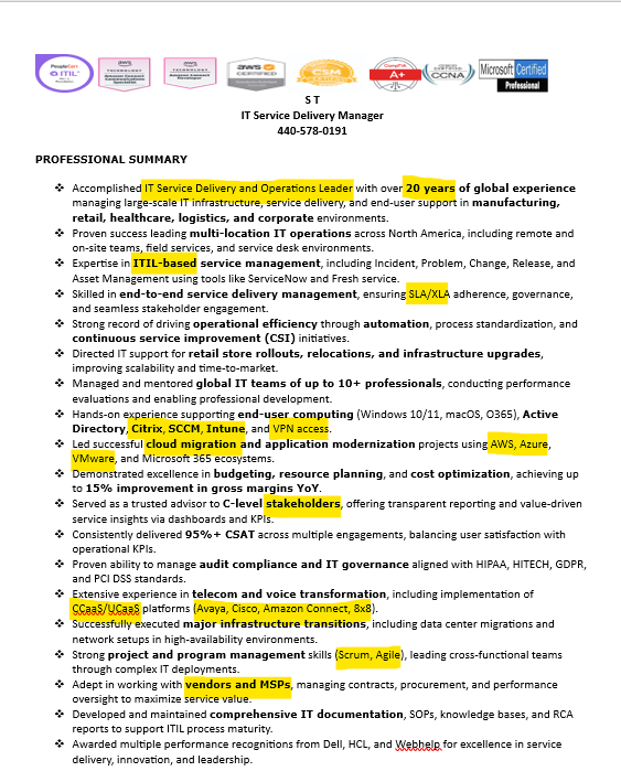 Accomplished IT Service Delivery and Operations Leader with over 20 years of global experience managing large-scale IT infrastructure, service delivery, and end-user support in manufacturing, retail, healthcare, logistics, and corporate environments. Proven success leading multi-location IT operations across North America, including remote and on-site teams, field services, and service desk environments. Expertise in ITIL-based service management, including Incident, Problem, Change, Release, and Asset Management using tools like ServiceNow and Fresh service. Skilled in end-to-end service delivery management, ensuring SLA/XLA adherence, governance, and seamless stakeholder engagement. Strong record of driving operational efficiency through automation, process standardization, and continuous service improvement (CSI) initiatives. Directed IT support for retail store rollouts, relocations, and infrastructure upgrades, improving scalability and time-to-market. Managed and mentored global IT teams of up to 10+ professionals, conducting performance evaluations and enabling professional development. Hands-on experience supporting end-user computing (Windows 10/11, macOS, O365), Active Directory, Citrix, SCCM, Intune, and VPN access. Led successful cloud migration and application modernization projects using AWS, Azure, VMware, and Microsoft 365 ecosystems. Demonstrated excellence in budgeting, resource planning, and cost optimization, achieving up to 15% improvement in gross margins YoY. Served as a trusted advisor to C-level stakeholders, offering transparent reporting and value-driven service insights via dashboards and KPIs. Consistently delivered 95%+ CSAT across multiple engagements, balancing user satisfaction with operational KPIs. Proven ability to manage audit compliance and IT governance aligned with HIPAA, HITECH, GDPR, and PCI DSS standards. Extensive experience in telecom and voice transformation, including implementation of CCaaS/UCaaS platforms (Avaya, Cisco, Amazon Connect, 8x8). Successfully executed major infrastructure transitions, including data center migrations and network setups in high-availability environments. Strong project and program management skills (Scrum, Agile), leading cross-functional teams through complex IT deployments. Adept in working with vendors and MSPs, managing contracts, procurement, and performance oversight to maximize service value. Developed and maintained comprehensive IT documentation, SOPs, knowledge bases, and RCA reports to support ITIL process maturity. Awarded multiple performance recognitions from Dell, HCL, and Webhelp for excellence in service delivery, innovation, and leadership. Holds an Executive MBA (2024) and multiple technical certifications including AWS Solutions Architect, ITIL4, Scrum Master, ServiceNow Admin, CCNA Collaboration, and Microsoft 365 Admin. Keywords: cprogramm information technology |