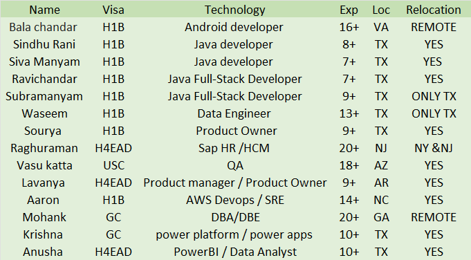 Trust, you are fine and doing well, Greetings from SR SOFT INC. This is MIKE, US IT Bench sales recruiter from SR SOFT INC Please go through below HOTLIST and let me know [email protected] OR call me +1 770-709-4679 Bala chandar H1B Android developer 16+ VA (REMOTE) Sindhu Rani H1B JAVA Developer 8+ TX (ONSITE ) Siva Manyam H1B JAVA Developer 7+ TX (ONSITE ) Ravi chandar H1B JAVA Developer 7+ TX (ONSITE ) Subramanyam H1B JAVA Developer 9+ TX (ONSITE ) Waseem H1B DATA ENGINEER 13+ TX (ONSITE ) Sourya H1B PROJECT MANAGER 9+ TX (ONSITE) Raghuram H4EAD Sap HR/HCM 20+ NJ ( NY & NJ) Vasu katta USC QA 18+ AZ ( REMOTE ) Lavanya H4EAD Product manager/Owner 9+ AR (ONSITE) Aaron H1B AWS Devops / SRE 14+ NC (ONSITE) Mohank GC DBA/DBE 20+ GA (REMOTE) KrishnaM GC Power platform /Apps 10+ TX (ONSITE) Anusha H4EAD PowerBI / Data analyst 10+ TX (ONSITE) Keywords: quality analyst information technology golang green card Arizona Arkansas Georgia New Jersey New York North Carolina Texas Virginia |